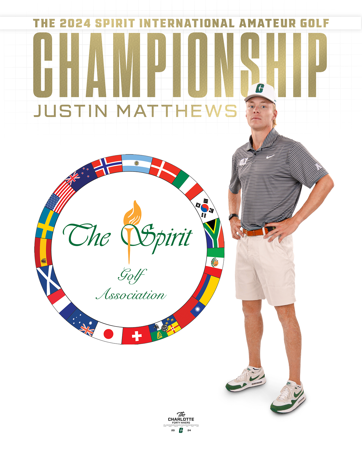 A collection of work created and used to market the men's and women's Golf teams via print and social media for The University of Charlotte at North Carolina's Athletics Department. Graphics were used on social media platforms such as, Instagram and Twitter to promote fan engagement and celebrate player accomplishments. Design features photoshop manipulation of player photographs, typography arrangements, and additions of textures and patterns. All elements are within the UNC Charlotte design guidelines.